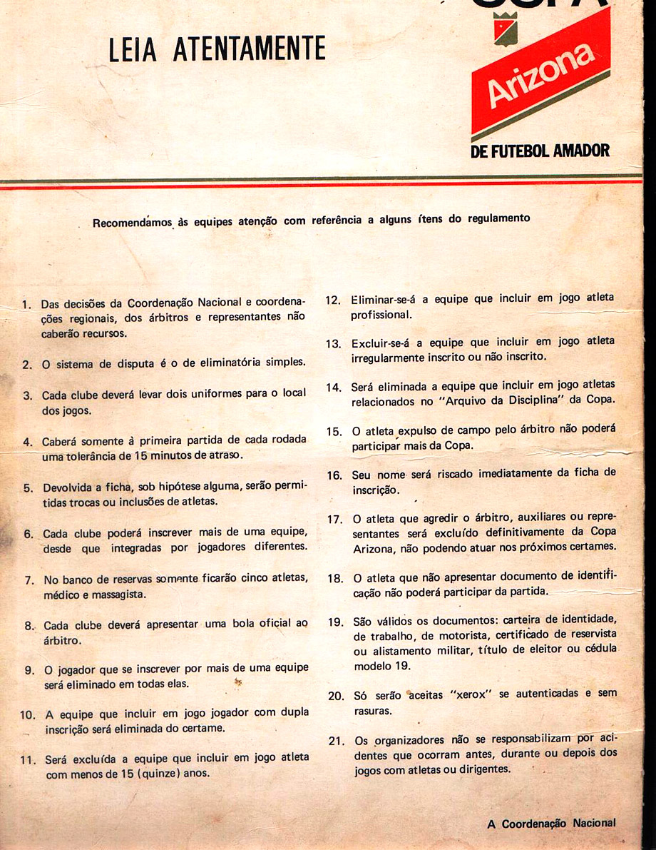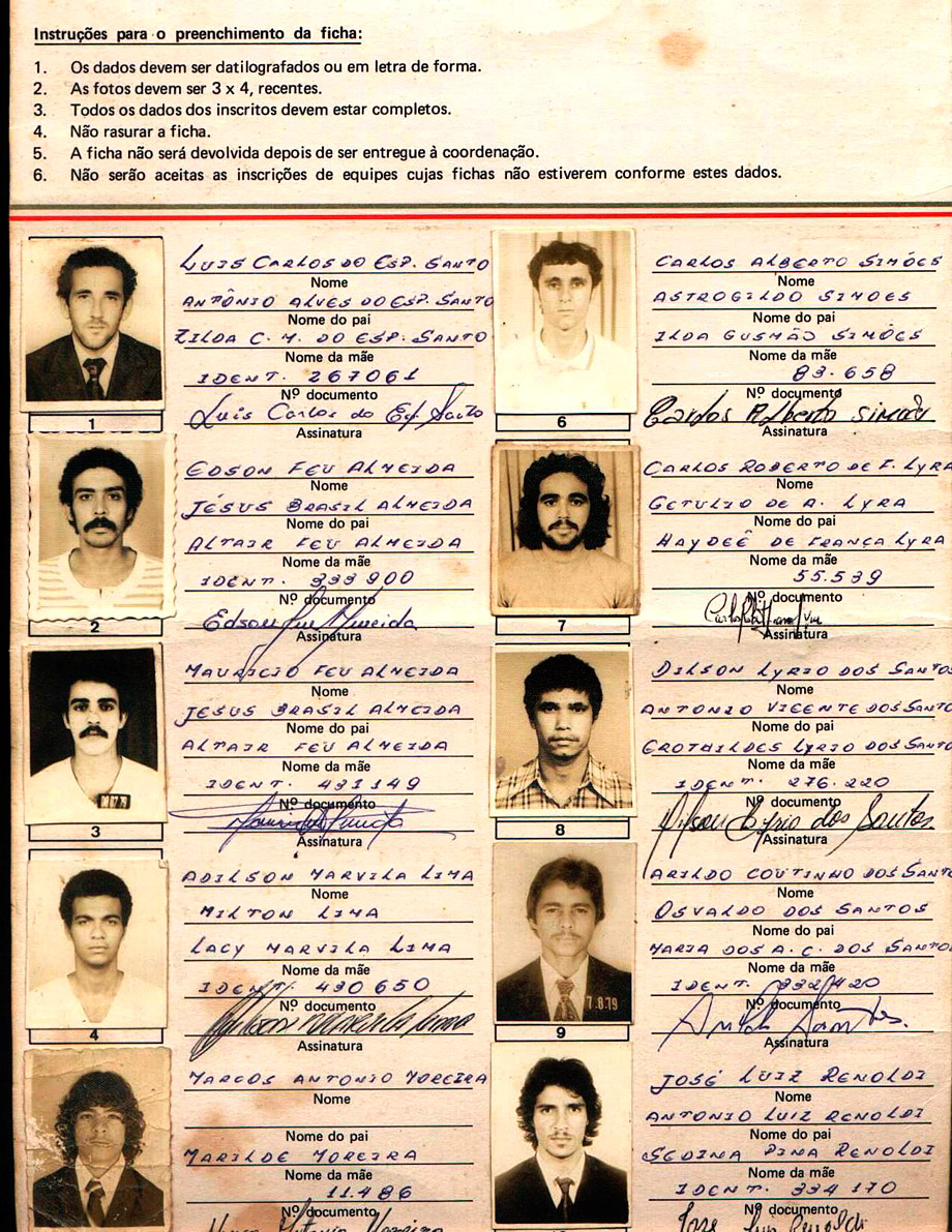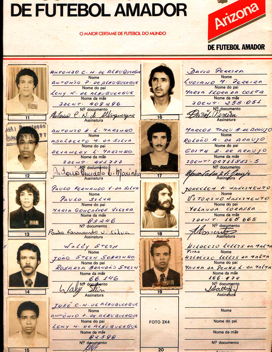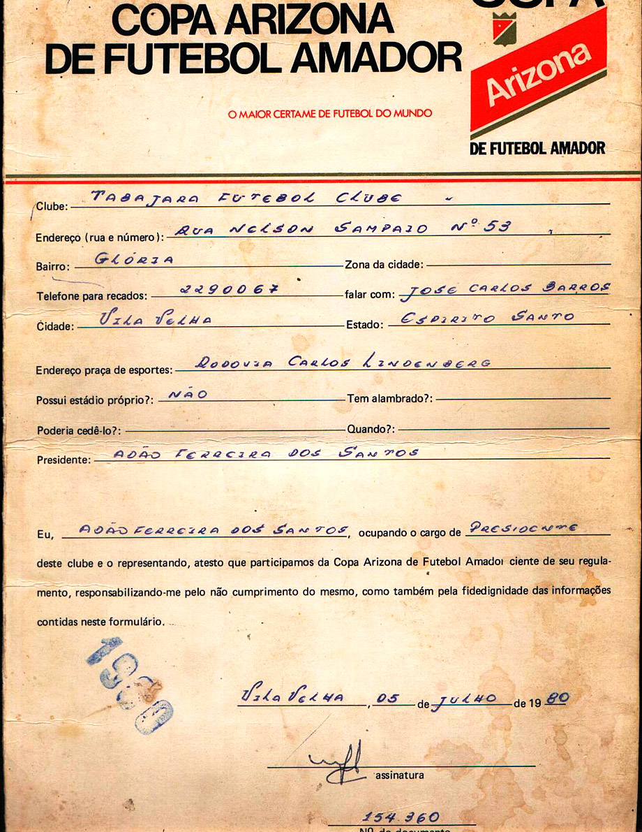 Copa Arizona - 1980 - Ficha de Inscrição do Time TABAJARA FC.